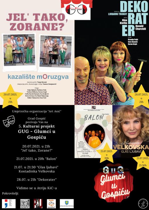 Umjetnička organizacija „Art Asić“ i Grad Gospić u suradnji s Kulturno Informativnim Centrom Gospić pozivaju vas na 5. izdanje Glumaca u Gospiću koje će se održati od 20. do 28. srpnja 2022. godine u Atriju KIC-a Gospić. Na rasporedu su sljedeće predstave: “Jel’ tako, Zorane?” U izvedbi Kazališta Moruzgva, “Balon” u izvedbi Amaterskog kazališta Gospić, “Glas ljubavi” u izvedbi velike Kostadinke Velkovske i šećer na kraju “Dekorater” u izvedbi kazališne grupe Lectirum. Pokrovitelji: Ministarstvo kulture i medija RH, Ličko-senjska županija i POU Gospić. Medijski pokrovitelj je Radio Gospić. Pridružite nam se, a svoj dolazak potvrdite na mail adresu: kic-gospic@kic-gospic.eu ili na broj mobitela 099/202-2838. Vidimo se!