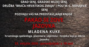 Grad Senj, Gradski muzej Senj, Družba „Braća Hrvatskog Zmaja“ i Pučko otvoreno učilište Milutina Cihlara Nehajeva Senj pozivaju vas na predstavljanje knjige Mladena Kuke „Pakao se zove Jazovka“ 23. veljače (ponedjeljak) u 18 sati u Domu kulture Senj. Mladen Kuka karlovački je speleolog, planinar i alpinist koji je otkrio jamu …