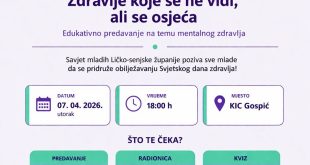 Savjet mladih Ličko-senjske županije priprema edukativno predavanje „Zdravlje koje se ne vidi, ali se osjeća” — jer o mentalnom zdravlju vrijedi razgovarati glasno.Pridruži nam se u utorak, 7. travnja u 18:00 sati u KIC-u Gospić. Osim predavanja, čekaju te interaktivna radionica i kviz s nagradama.Ulaz je slobodan — samo dođi! …
