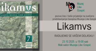 Promocija sedmog broja muzejskog časopisa Likamvs održat će se u četvrtak, 23. listopada, u 19.00 sati u Malom salonu Muzeja Like Gospić. Likamvs je stručni časopis Muzeja Like Gospić koji izlazi jednom godišnje. Izvor, foto. : MLG