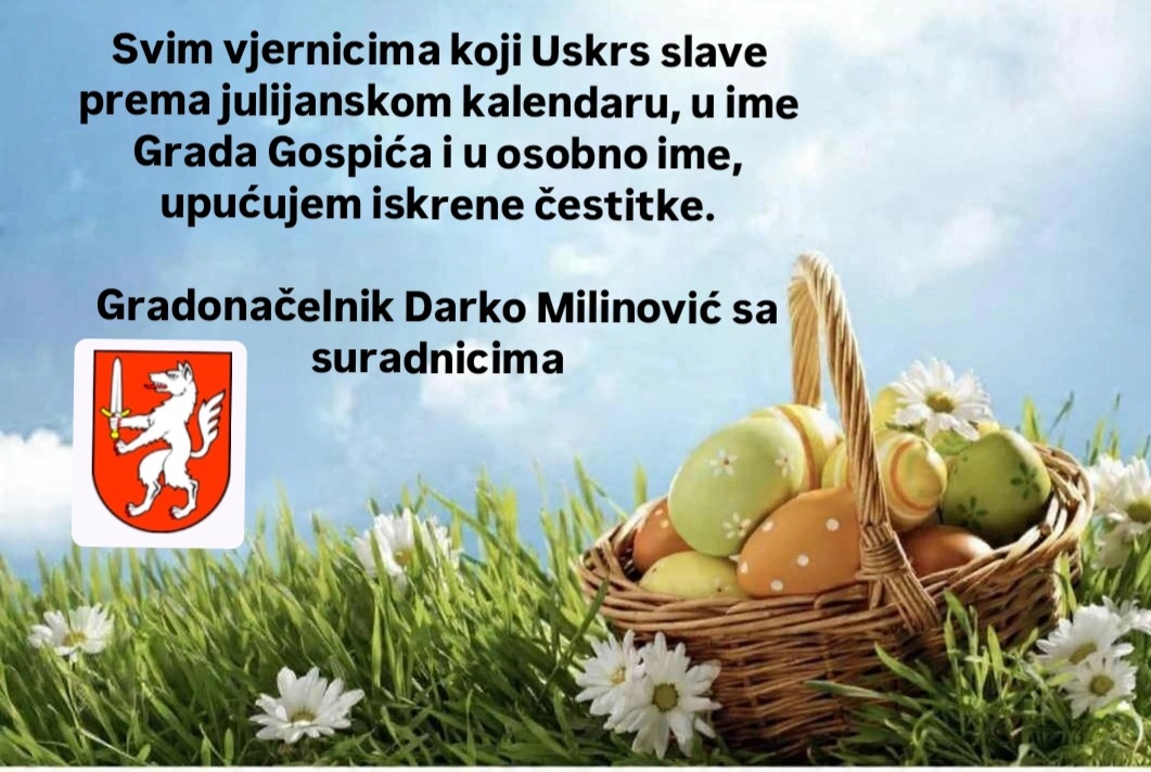 Gradonačelnik grada Gospića Darko Milinović sa suradnicima uputio je čestitku svim vjernicima koji Uskrs slave prema julijanskom kalendaru. Gradonačelnik u svoje osobno ime i u ime grada Gospića upućuje iskrene čestitke.