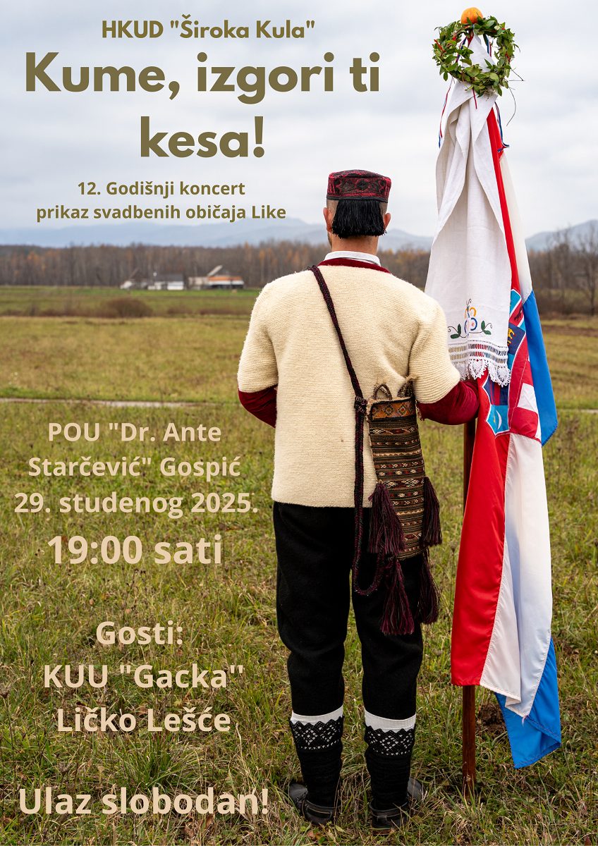 HKUD “Široka Kula” najavljuje svoj 12. godišnji koncert pod nazivom “Kume, izgori ti kesa!”, koji će ove godine donijeti prikaz tradicionalnih ličkih svadbenih običaja. Koncert će se održati 29. studenog 2025. godine u 19:00 sati u Pučkom otvorenom učilištu “Dr. Ante Starčević” u Gospiću.Publiku očekuje autentičan povratak u prošlost kroz pjesmu, ples, nošnje i običaje koji su obilježili ličke svadbe kroz generacije. Uz domaćine, na pozornici će nastupiti i gosti – KUU “Gacka” Ličko Lešće, koji će dodatno obogatiti program svojim izvedbama. Ulaz na događaj je slobodan, a organizatori pozivaju sve ljubitelje tradicije, folklora i kulturne baštine da im se pridruže na večeri ispunjenoj običajima, glazbom i zajedništvom.