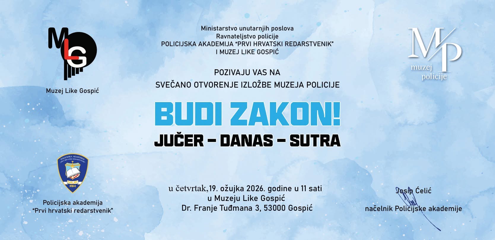 Muzej Like Gospić poziva Vas na otvorenje izložbe BUDI ZAKON! Jučer – danas – sutra u organizaciji Muzeja policije i Muzeja Like Gospić u četvrtak, 19. ožujka u Malom salonu Muzeja Like Gospić.