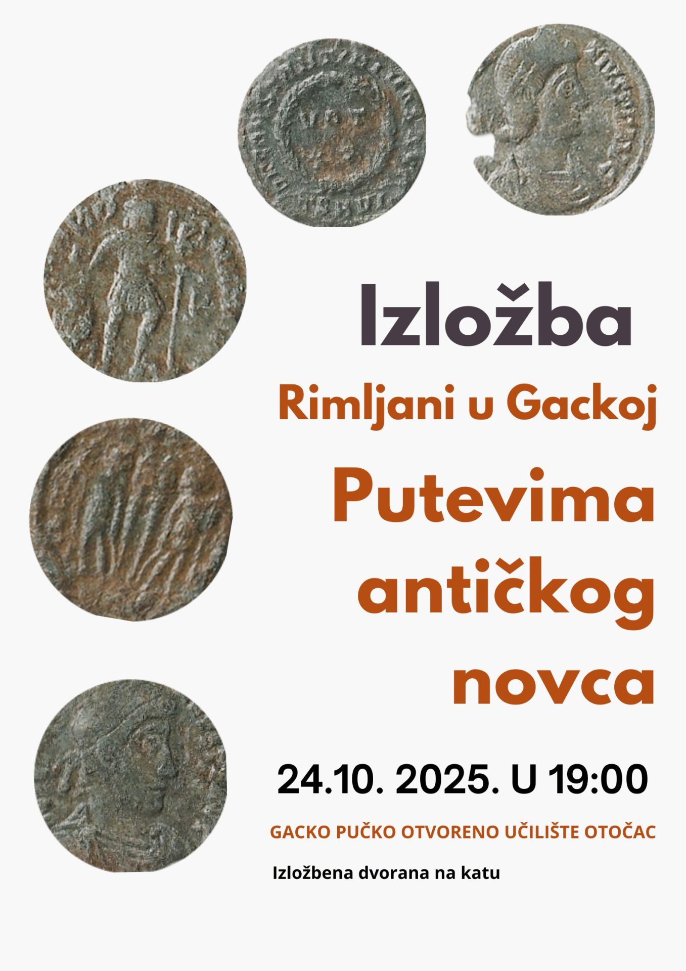 Oko 200 antičkih novčića sačuvano je u numizmatičkoj zbirci Muzeja Gacke, a izdvojeni primjerci novca iz 3. i 4. stoljeća bit će predstavljani na ovoj izložbi. Izložba ne donosi samo priču o antičkom novcu, već i o rimskim carevima, materijalima od kojih je novac izrađen, kovnicama i putevima kojima je novac dolazio do Gacke i putovao Rimskim Carstvom.