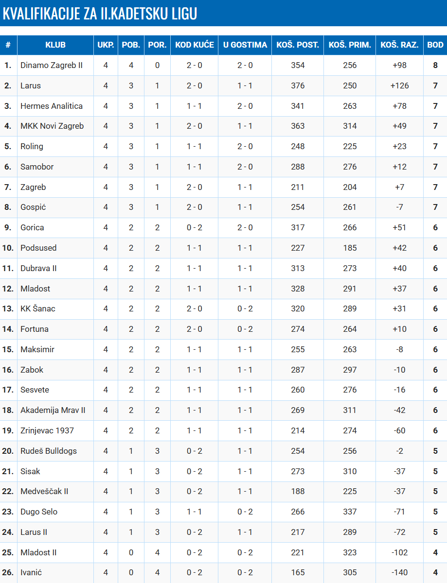 Kvalifikacije su otvorene pobjedom protiv Mladosti (73-70), u utakmici koja je nagovijestila karakter ekipe – borbenost, upornost i zajedništvo te sposobnost vraćanja iz minusa. U drugom kolu slijedila je gostujuća pobjeda nad Maksimirom (59-48) u defanzivno tvrdom susretu koji je donio drugu uzastopnu pobjedu i potvrdu stabilnosti. Ipak, treće kolo protiv Zagreba donijelo je jedini, ali težak poraz (46:84), Upravo je taj susret postao prijelomna točka, umjesto pada, taj poraz bio je poticaj — lekcija koja je pomogla ekipi da sazrije i pronađe pravi ritam – lekcija koja je ekipi pokazala gdje mora rasti. Važna lekcija o razlici između tempa, iskustva i širine rostera na višoj razini natjecanja. Od tog trenutka Gospić više nije tražio izgovore, nego rješenja. U narednoj utakmici u izravnom dvoboju za ulazak u II. Ligu u odlučujućem, četvrtom kolu, kadeti su odigrali najzreliju utakmicu kvalifikacija i nadigrali Sesvete s uvjerljivih 76:59, čime su potvrdili plasman u II. ligu. Ekipa je počela igrati s više samopouzdanja, jasnijim rotacijama i boljom energijom u obrani, pokazujući zrelost i kontrolu igre. Nakon početnih 16:18, Gospić je u drugoj i trećoj četvrtini potpuno preuzeo kontrolu igre (43:21 u tom razdoblju). Obrana je bila na razini, a napad je pronašao ritam kroz brze tranzicije i kolektivni pristup.