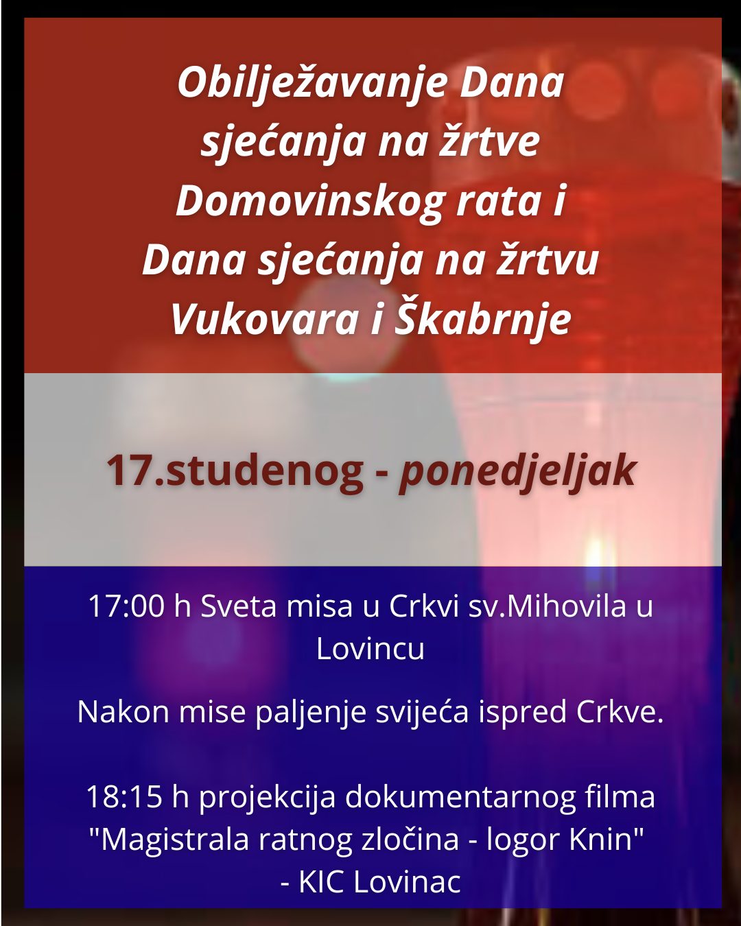 U ponedjeljak, 17. studenog, u Lovincu će se održati prigodni program povodom obilježavanja Dana sjećanja na žrtve Domovinskog rata te Dana sjećanja na žrtvu Vukovara i Škabrnje. Program je organiziran kako bi se dostojanstveno očuvalo sjećanje na sve žrtve, odalo počast braniteljima i civilima te potaknulo razumijevanje i njegovanje istine o Domovinskom ratu. Okupljanjem se želi očuvati uspomenu na stradale, zahvaliti preživjelima, te mladim generacijama prenijeti istinu kako bi sjećanje ostalo živo, a vrijednosti slobode, zajedništva i odgovornosti bile trajno ukorijenjene u društvu. U 17:00 sati služit će se Sveta misa za sve poginule, nestale i stradale u Domovinskom ratu u Crkvi sv. Mihovila u Lovincu. Nakon mise uslijedit će paljenje svijeća ispred crkve.