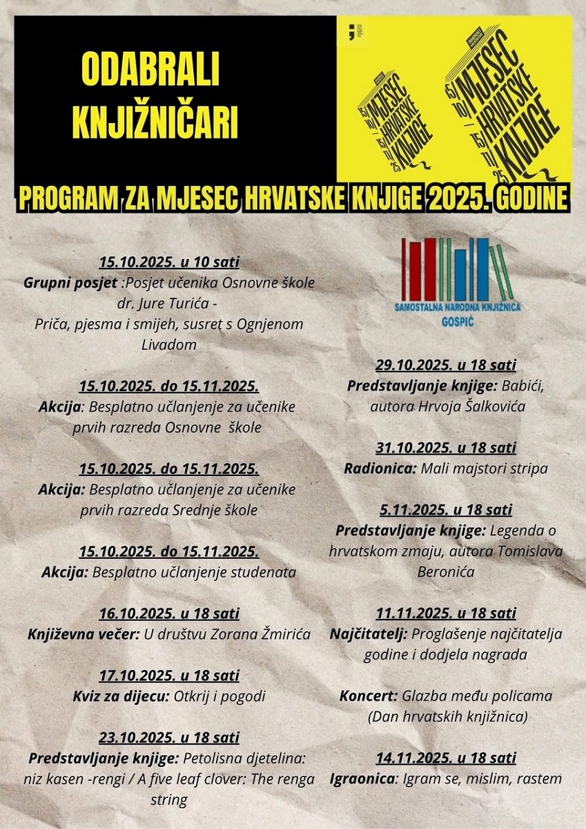 Grupnom posjetom učenika Osnovne škole dr.Jure Turića Gospić i uz priču, pjesmu i smijeh kroz susret s Ognjenom Livadom u srijedu 15.listopada počinje Mjesec hrvatske knjige u Samostalnoj narodnoj knjižnici Gospić. Mjesec hrvatske knjige ove godine obilježava se pod motom „Odabrali knjižničari“ a sadržava niz zanimljivih događanja sve do 14.studenoga kada će završiti Igraonicom za djecu „Igram se, mislim, rastem“. Izdvajamo književnu večer 16.listopada U društvu Zorana Žmirića, predstavljanje knjige Babići autora Hrvoja Šalkovića 29.listopada i knjige Legenda o hrvatskom zmaju autora Tomislava Beronića. Tijekom trajanja Mjeseca hrvatske knjige besplatno će se moći učlaniti u knjižnicu učenici prvih razreda osnovne i srednje škole, te studenti. Cjelovit program pogledajte na popratnom plakatu