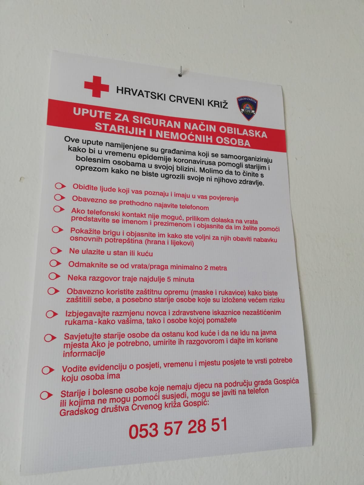 Od jučer, 25.3.2020.g.djelatnici naše tvrtke , u dogovoru s Crvenim križem, postavljaju informativne plakate s uputama za siguran način obilaska starijih i nemoćnih osoba, na ulaznim prostorima svih stambenih zgrada. Ukupno će se postaviti 300 plakata u 47 stambenih zgrada na Ličkom Osiku i 75 u Gospiću, koje se nalaze u sustavu stambene pričuve. Također, na svim ulaznim vratima postavljene su naljepnice s telefonskim brojem 112 DUZS-a.