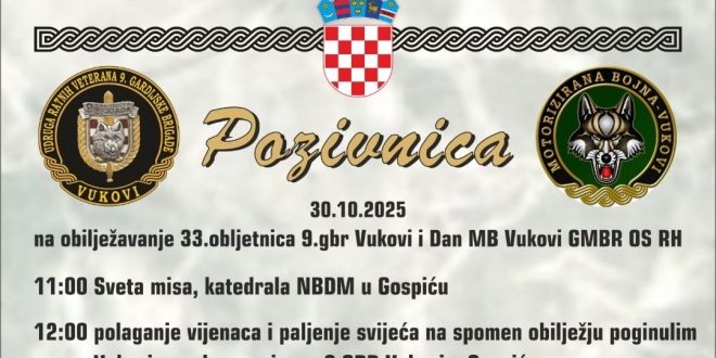 U četvrtak, 30. listopada, 9. gardijska brigada slavi 33. rođendan i svoj dan. Program će započeti u 11 sati svetom misom u gospićkoj katedrali. U podne će biti polaganje vijenaca i paljenje svijeća na spomen obilježju poginulim Vukovima na ulazu u vojarnu koja prema njima i nosi ime. U 12:30 sati svečano će biti dodijeljene beretke pripadnicima brigade uz prigodni program.