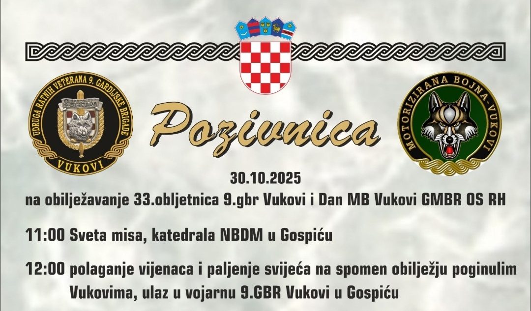 U četvrtak, 30. listopada, 9. gardijska brigada slavi 33. rođendan i svoj dan. Program će započeti u 11 sati svetom misom u gospićkoj katedrali. U podne će biti polaganje vijenaca i paljenje svijeća na spomen obilježju poginulim Vukovima na ulazu u vojarnu koja prema njima i nosi ime. U 12:30 sati svečano će biti dodijeljene beretke pripadnicima brigade uz prigodni program.
