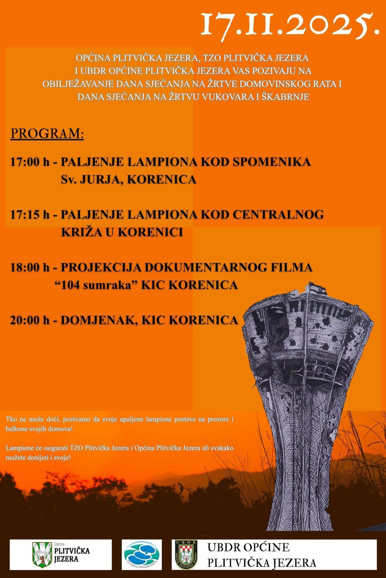 Općina Plitvička Jezera poziva sve – djecu, mlade, roditelje, bake i djedove – da se u ponedjeljak, 17. studenog, u 17:00 sati pridruže kod spomenika sv. Jurja u Korenici. Zajedno će zapaliti lampione i u koloni krenuti prema centralnom križu u Korenici, gdje će se pomoliti i odati počast svim žrtvama.