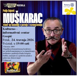 Stand-up komedija „Muškarac“ u izvedbi Pedja Bajović održat će se u Kulturno-informativnom centru u Gospiću u petak, 24. travnja s početkom u 19:00 sati. Riječ je o duhovitoj i iskrenoj predstavi koja na zabavan način progovara o roditeljstvu i razmnožavanju, kroz prepoznatljiv stil stand-up komedije.