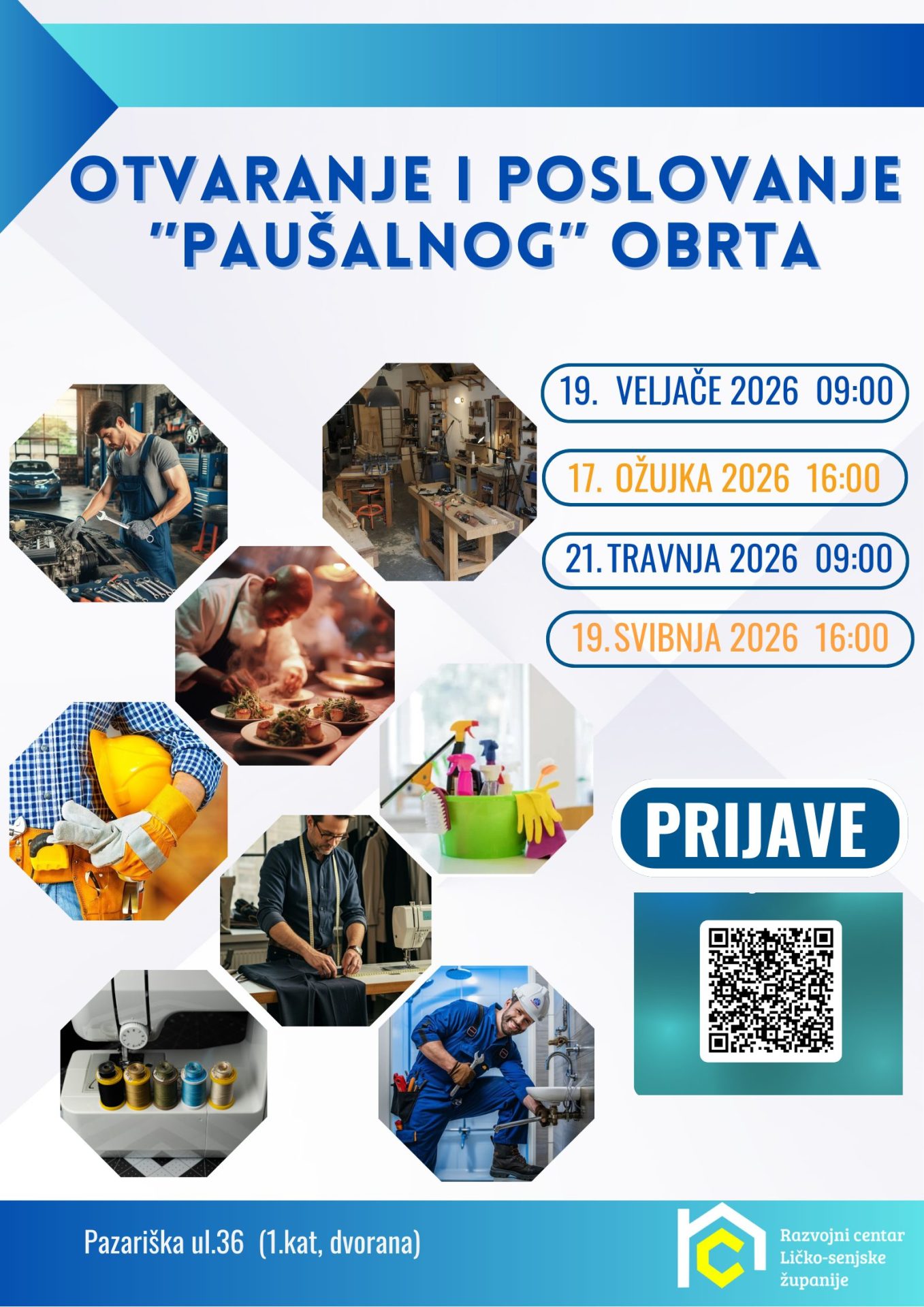 Poduzetnički inkubator Razvojnog centra Ličko-senjske županije organizira stručne radionice namijenjene svima koji razmišljaju o pokretanju paušalnog obrta, ali i postojećim obrtnicima koji žele bolje razumjeti porezne, financijske i administrativne obveze poslovanja.