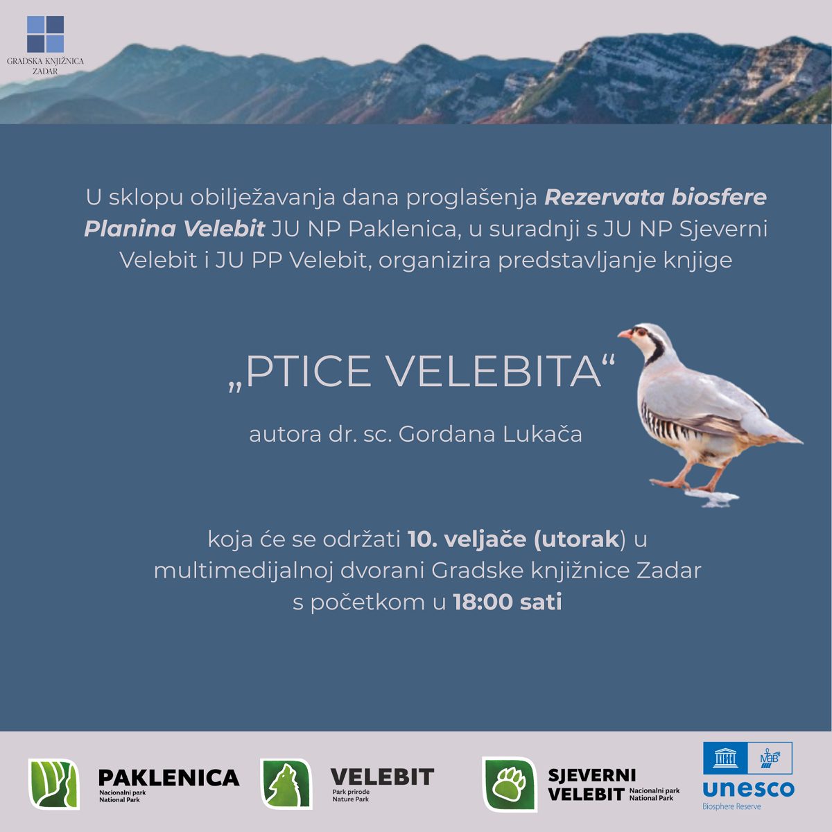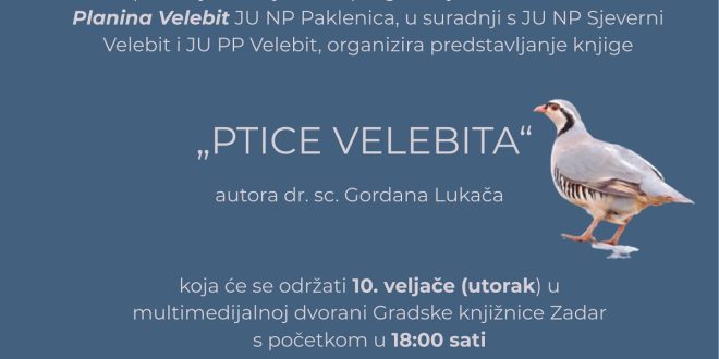 U sklopu obilježavanja dana proglašenja Rezervata biosfere planina Velebit Javna ustanova Nacionalni park Paklenica u suradnji s Javnim ustanovama Nacionalni park Sjeverni Velebit i Park prirode Velebit organizira predstavljanje knjige „Ptice Velebita“ autora dr.sc.Gordana Lukača. Predstavljanje će se održati u utorak 10.veljače s početkom u 18 sati u multimedijalnoj dvorani Gradske knjižnice Zadar.