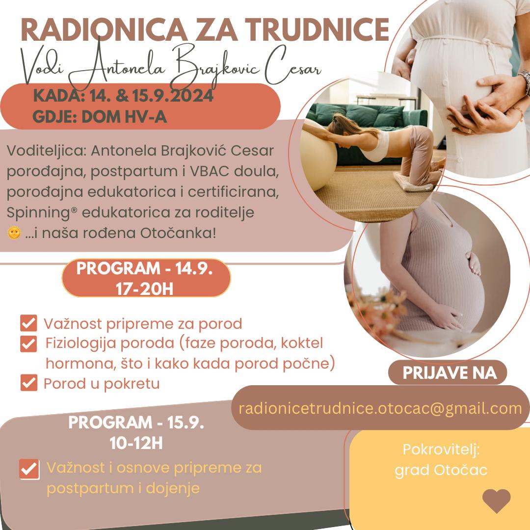 U Otočcu će se 14. i 15. rujna 2024. godine održati besplatna radionica za trudnice, koju vodi Antonela Brajković Cesar, certificirana doula za porođaj, postpartalnu njegu i VBAC (vaginalni porod nakon carskog reza), te edukatorica za roditelje i Spinning® metodu. Radionica će se održati u zgradi Doma Hrvatske vojske, a namijenjena je svim budućim majkama i onima koje žele saznati više o pripremi za porod i postpartalnom razdoblju.