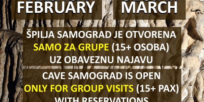 Tijekom veljače i ožujka špilja Samograd je otvorena samo za grupe (više od 15 osoba), uz obaveznu najavu.