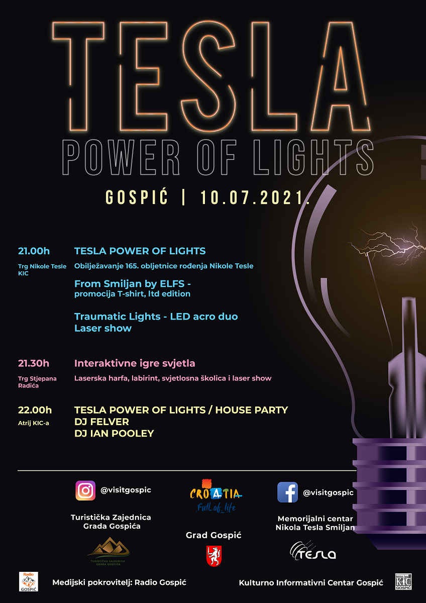 GOSPIĆ- U sklopu obilježavanja 165. obljetnice rođenja Nikole Tesle priređeno je mnoštvo sadržaja kako bi sve nas podsjetilo na činjenicu da je u Lici rođen jedan od najvećih svjetskih genija Nikola Tesla. I ove godine biti će svjetlosni spektakl u Gospiću i okolici gdje će građani i posjetitelji moći vidjeti laser show, izvanredne svjetlosne efekte koji će prošarati nebo iznad grada, uz mnoštvo sadržaja i programa na glavnom gradskom trgu :Interaktivne igre svjetla, lasersku harfu, Svjetlosni labirint… dio programa će se odvijati i na novoizgrađenom Trgu Nikola Tesla 21,00 h promocija T-shirt From Smiljan by ELFS , Traumatic Lights-led acro duo i Laser show, te u Atrij-u Kic-a : House party krenuti će u 22,00 h DJ FELVER i DJ IAN PODLEY. Pod obojenim svjetlosnim snopovima biti će zgrade vezane za život Nikole Tesle u Gospiću, a vrata Memorijalnog centra u Smiljanu imaju 10.07. Open day.