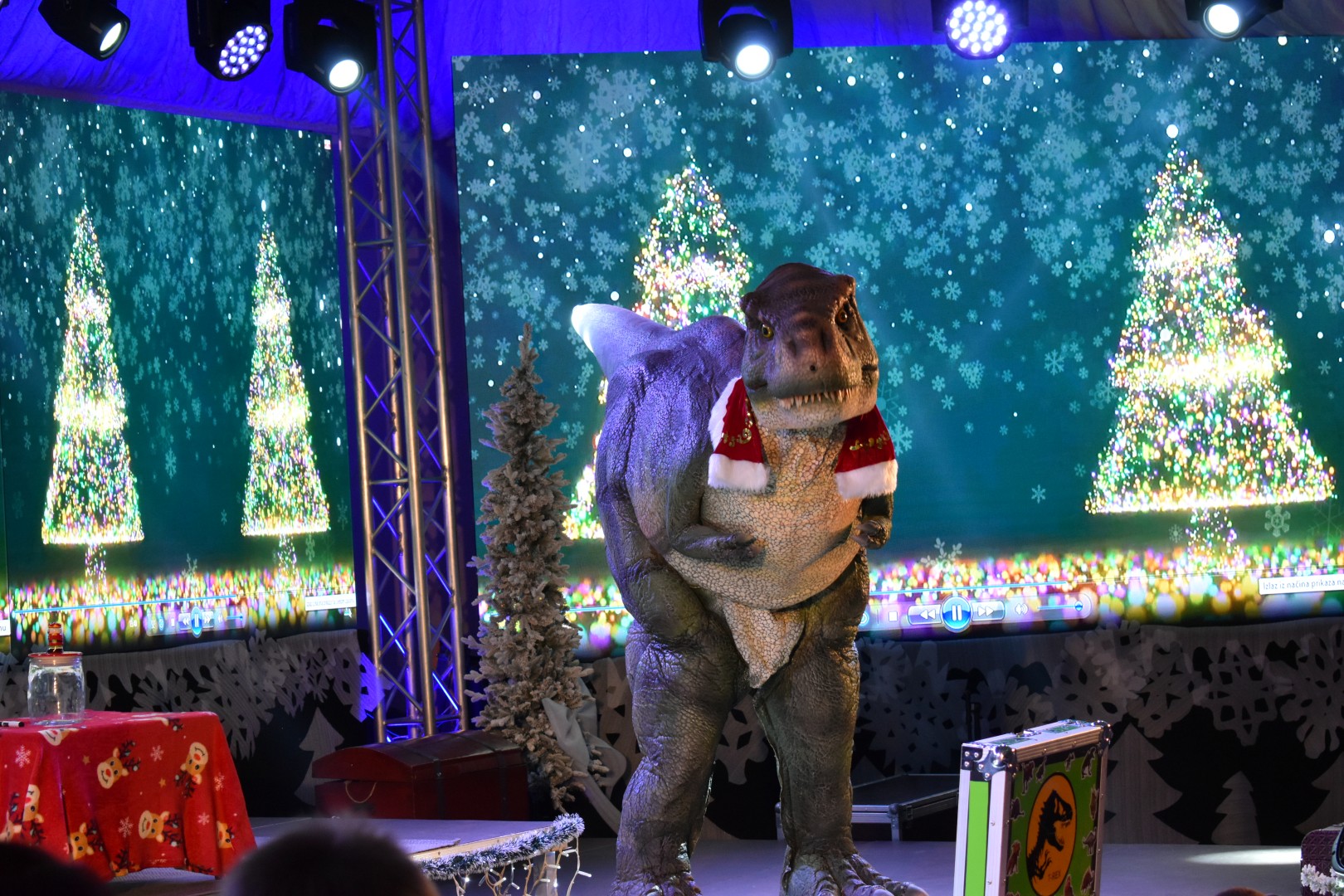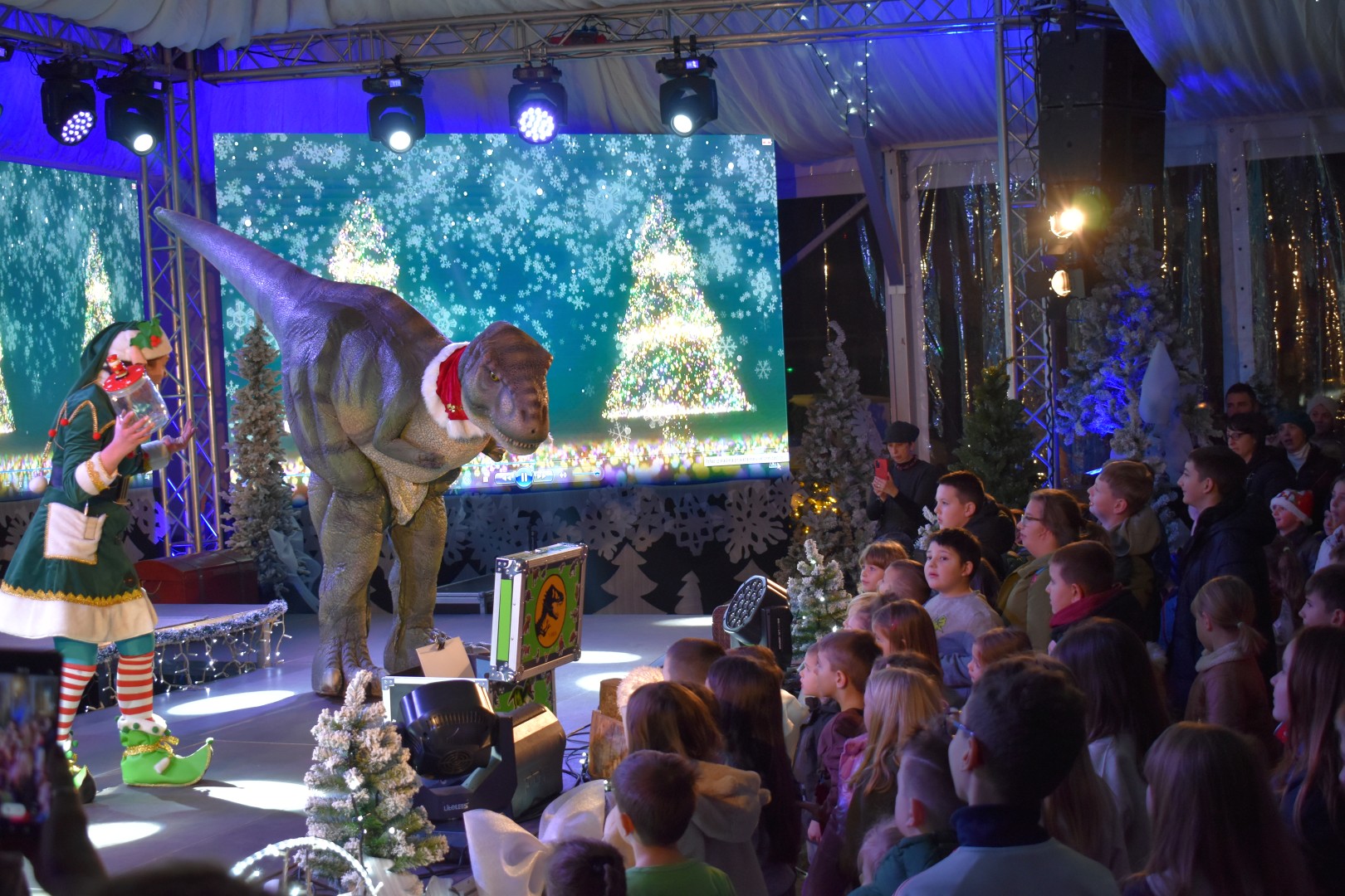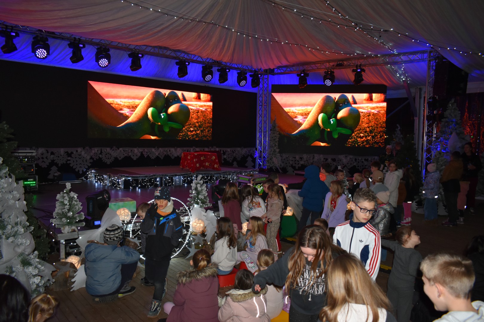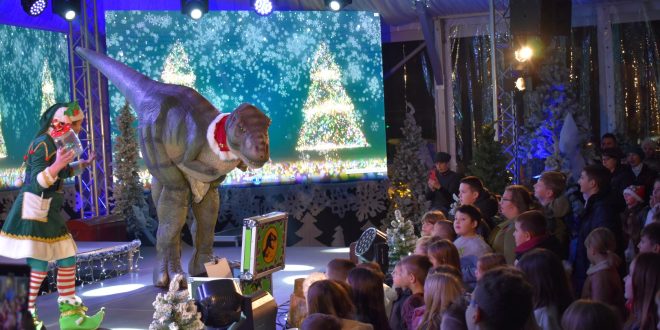 Program “Advent u Gospiću” nastavlja pružati zabavu najmlađima. Sinoć su imali priliku pogledati animirani film „Avanture malog dinosaura“, a prava zabava je uslijedila s dolaskom pet metara dugog dinosaura T-rexa. Mnoštvo djece uživalo je uz animatoricu i T-rexa, a potom i uz prigodnu glazbu.