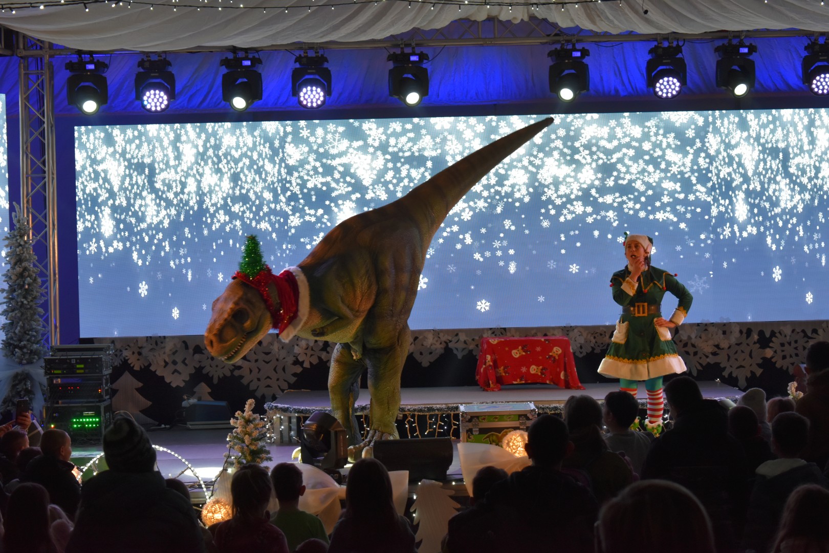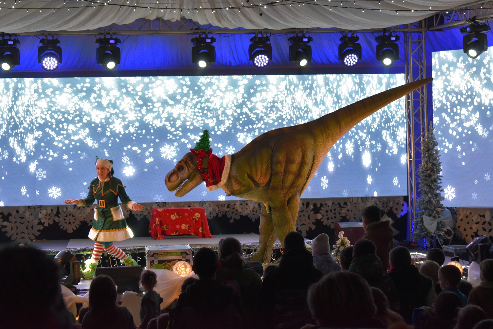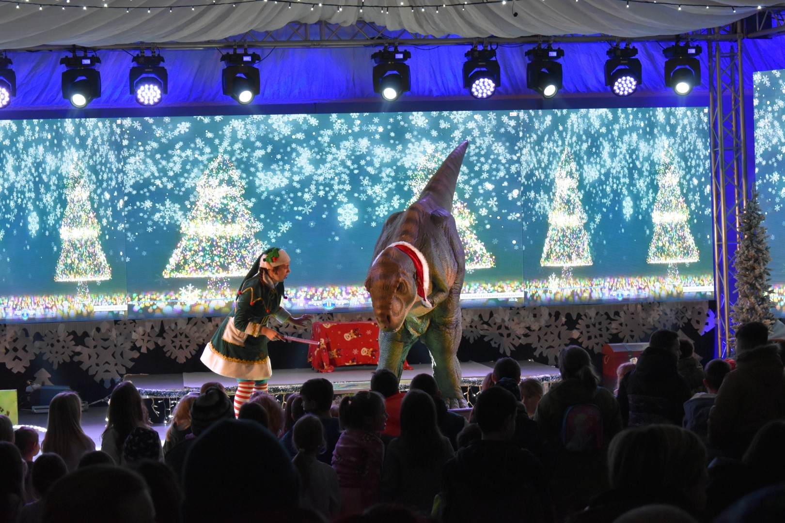 Program “Advent u Gospiću” nastavlja pružati zabavu najmlađima. Sinoć su imali priliku pogledati animirani film „Avanture malog dinosaura“, a prava zabava je uslijedila s dolaskom pet metara dugog dinosaura T-rexa. Mnoštvo djece uživalo je uz animatoricu i T-rexa, a potom i uz prigodnu glazbu.