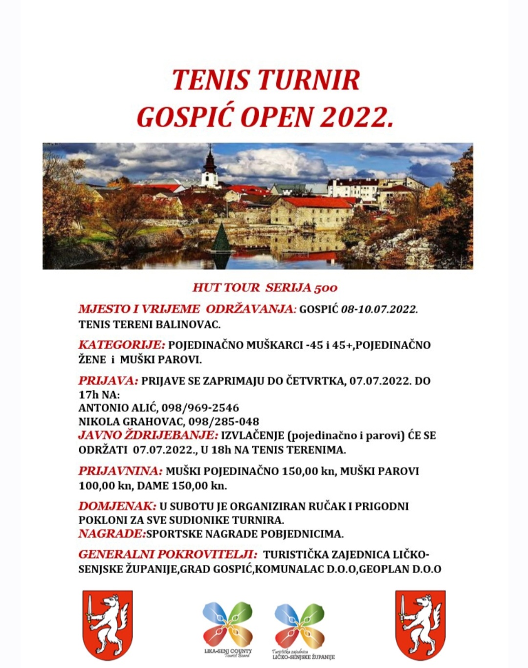 Teniski klub „Lika“ Gospić organizira Teniski Turnir Gospić Open 2022. koji je dio HUT Tour serije 500. Ovaj sportski događaj održat će se na tenis terenima na Balinovcu od 8. do 10. srpnja. Igra se u kategorijama pojedinačno muškarci -45 i 45+, pojedinačno žene i muški parovi. Što se tiče prijavnina muški pojedinačno plaćaju 150 kn, muški parovi 100 kn, a dame 150 kn. Prijave se zaprimaju do četvrtka, 7. srpnja do 17 sati kod Antonia Alića na broj 098/969-2546 i Nikole Grahovca na 098/285-048. Javno ždrijebanje održat će se 7. srpnja u 18 sati u parku Jasikovac. Uz organizirani ručak i prigodne poklone za sve sudionike turnira, osigurane su i sportske nagrade pobjednicima.