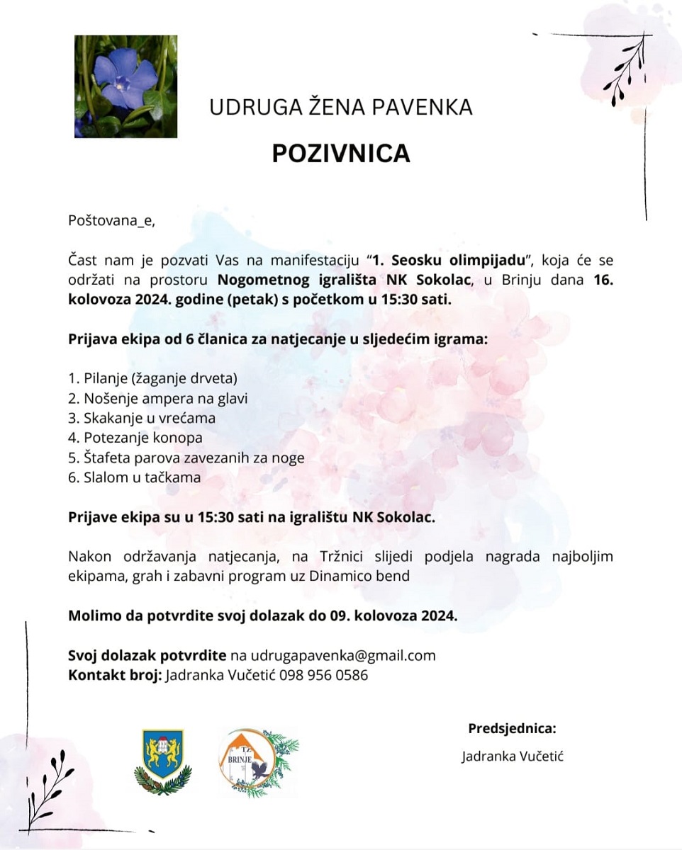Udruga žena Pavenka u suradnji s Općinom Brinje i Turističkom zajednicom Općine Brinje organizira 1. Seosku olimpijadu. Olimpijada će se održati 16. kolovoza na nogometnom igralištu NK Sokolac u Brinju s početkom u 15:30 sati. Organizatori pozivaju sve zainteresirane da se prijave na sudjelovanje te garantiraju dobru zabavu, druženje i mnoštvo zanimljivih igara. Zainteresirani se mogu prijaviti do 09. kolovoza na mail: udrugapavenka@gmail.com, kontakt broj Jadranka Vučetić 0989560586.