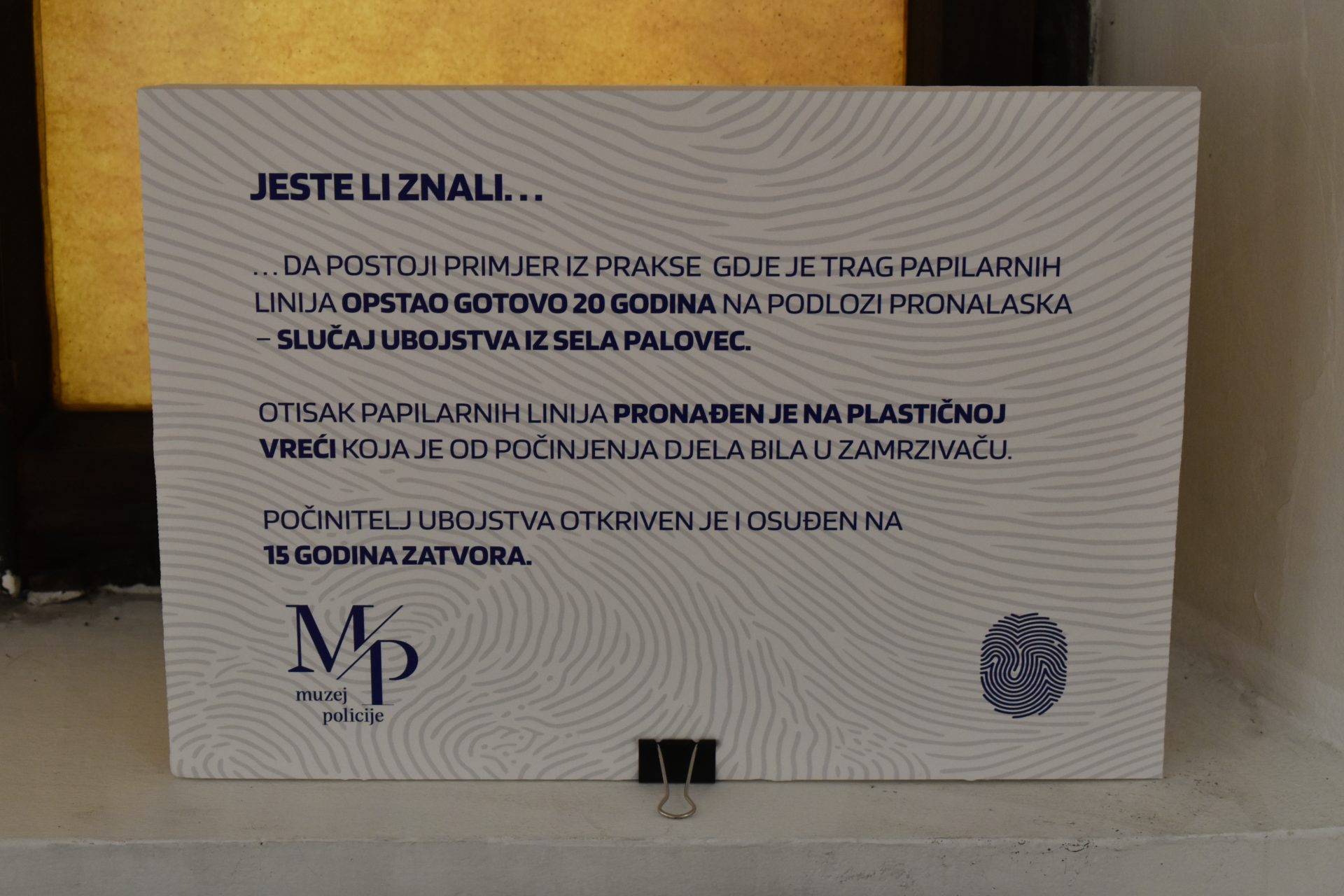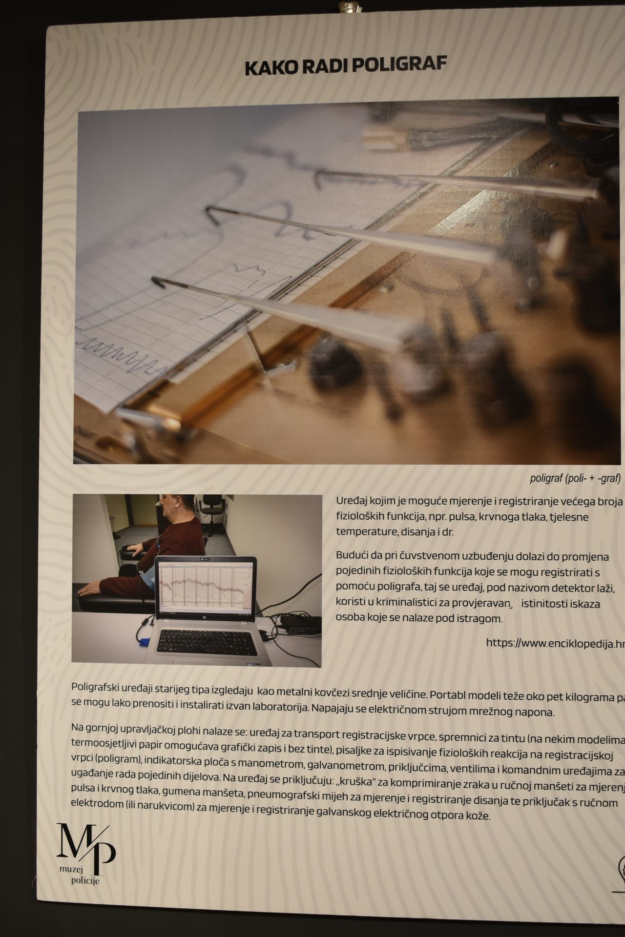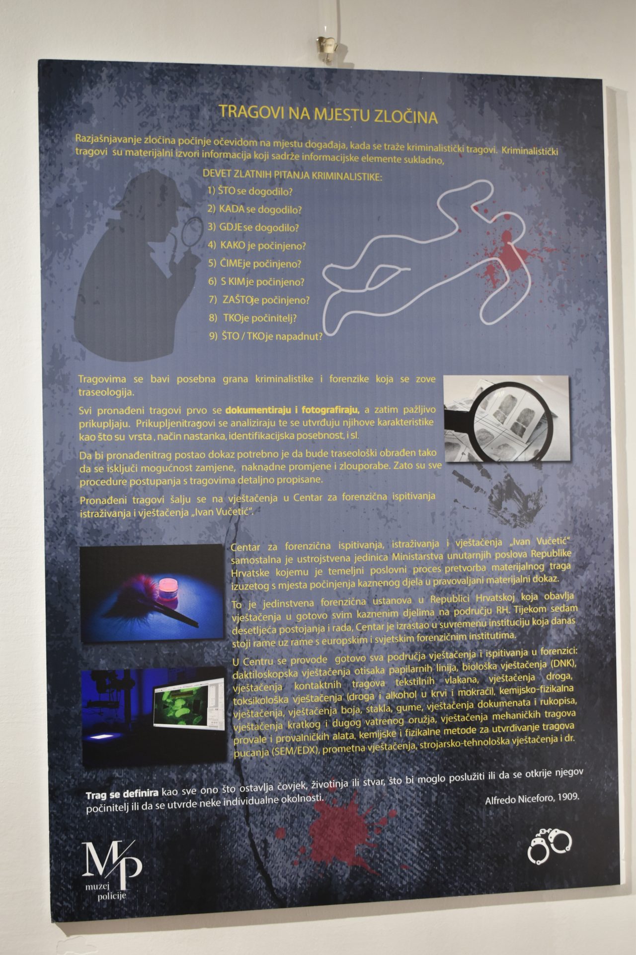 Izložba pruža jedinstven uvid u bogatu povijest i razvoj hrvatske policije. Zanimljiv i dinamičan postav prikazuje povijest hrvatske policije, njezin angažman i ulogu u Domovinskom ratu, kao i mnogobrojne zanimljive pojedinosti iz rada policije, posebice kriminalističke policije. Posjetitelji će moći razgledati izložene eksponate, uključujući raznu opremu, uniforme, arhivske materijale i staro oružje. Također, posjetite li izložbu imat ćete priliku saznati sve pojedinosti o načinu rada poligrafa, te upotrebi daktiloskopije u radu policije. U Malom salonu Muzeja Like Gospić izložbu možete pogledati do 24. travnja.