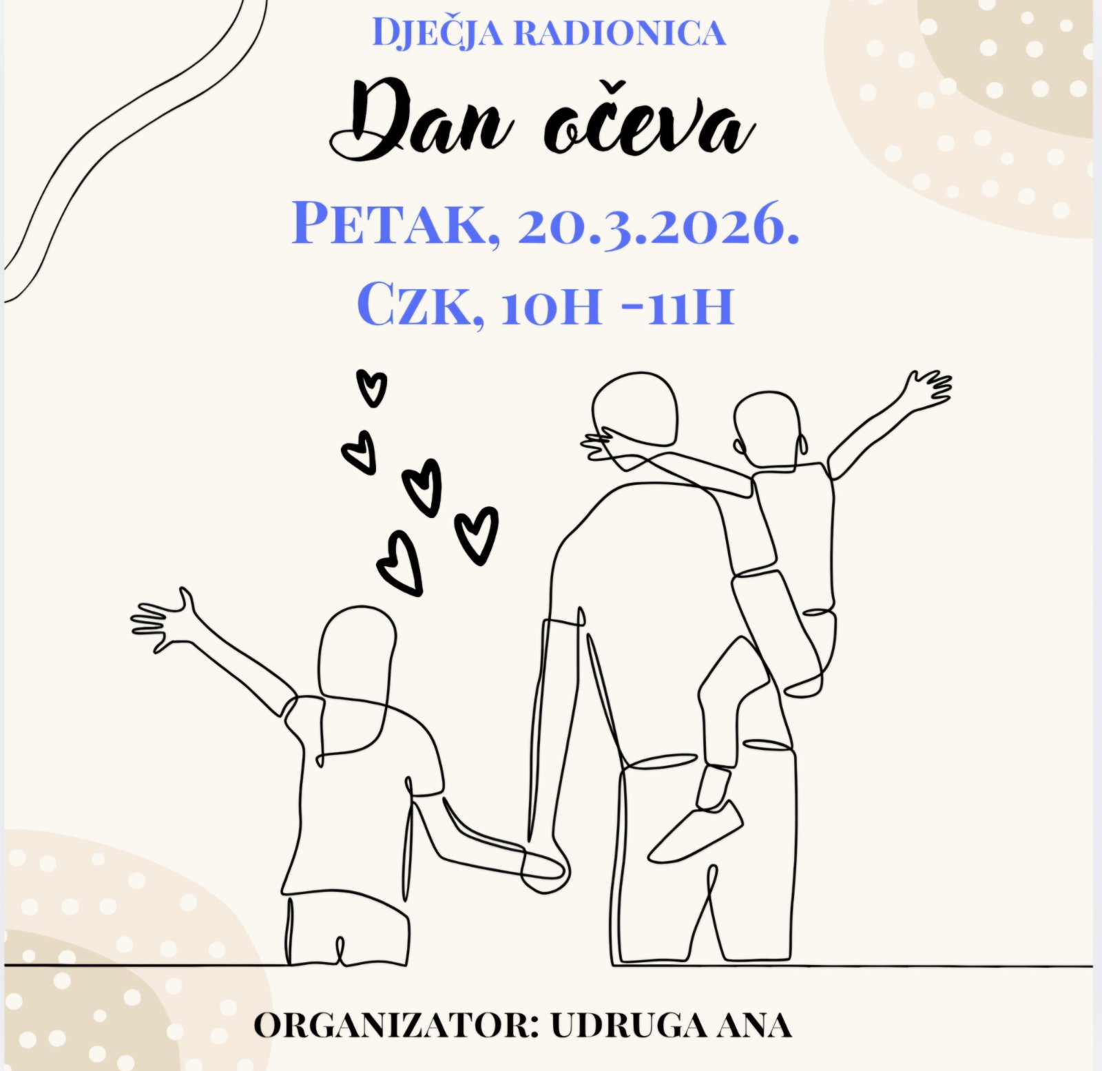 Riječ je o susretu u kojem će djeca imati priliku izraditi mali znak pažnje za svoje očeve, kao simbol ljubavi, zahvalnosti i bliskosti. Kroz kreativni rad, razgovor i zajedničko druženje djeca će na njima primjeren način promišljati o tome što za njih znači otac, kako im pruža sigurnost, podršku i ljubav, te zašto je važno pokazivati zahvalnost i nježnost unutar obitelji.