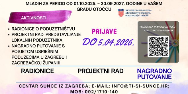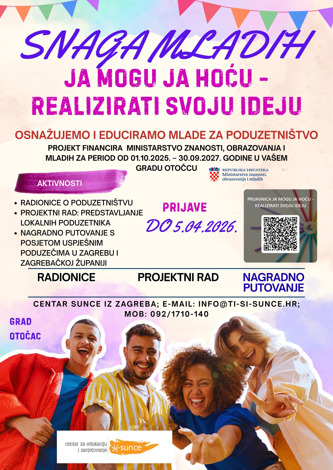 U partnerstvu s Centrom za edukaciju i savjetovanje Sunce iz Zagreba Grad Otočac provodi projekt za mlade na temu poduzetništva pod nazivom „Ja mogu, ja hoću-realizirati svoju ideju“.