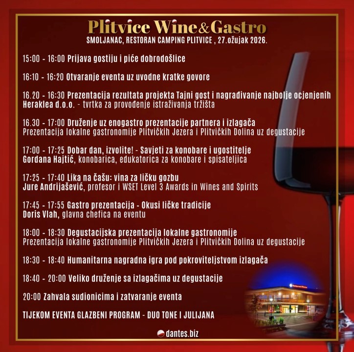 Očekuje vas večer ispunjena lokalnim gastronomskim specijalitetima, vrhunskim vinima, edukativnim prezentacijama i ugodnim druženjem s izlagačima i ljubiteljima eno-gastro scene. Posebno smo ponosni što događaj zadržava i svoj humanitarno-donacijski karakter, jer se ove godine donacije prikupljaju za dječaka Jana Rukavinu i obitelj Rukavina. Program uključuje zanimljive prezentacije, degustacije lokalnih proizvoda i delicija, nagrađivanja, kao i humanitarnu nagradnu igru. Čaša za degustaciju iznosi 5 €, a prvih 200 gostiju koji doniraju 10 € ili više dobiva čašu na poklon. Tijekom večeri za atmosferu će se pobrinuti glazbeni duo Tone i Julijana.Na jedinstvenoj eno-gastro večeri u srcu Plitvičkih jezera očekuju vas vrhunski okusi, inspirativne priče i stručni uvidi iz svijeta gastronomije i vina.Doris Vlah donosi posebnu gastro prezentaciju “Okusi ličke tradicije” – moderna interpretacija autentične ličke kuhinje. Jure Andrijašević vodi vas kroz vinsku priču “Lika na čašu: vina za ličku gozbu”. Gordana Hajtić dijeli svoje bogato iskustvo kroz predavanje “Dobar dan, izvolite! – savjeti za konobare i ugostitelje” . Za odličnu atmosferu tijekom večeri pobrinut će se Duo Tone & Julijana uz živu glazbu.”