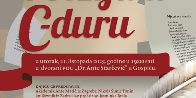 U dvorani Pučkog otvorenog učilišta “Dr. Ante Starčević” Gospić u utorak, 21. listopada, biti će predstavljena knjiga poezije akademskog glazbenika i književnika Danka Ivšinovića „Poezija u C-duru“.