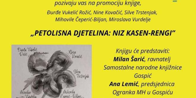 Ogranak Matice hrvatske u Gospiću i Samostalna narodna knjižnica Gospić pozivaju vas na promociju knjige „Petolisna djetelina: niz kasen-rengi“, zajedničkog pjesničkog projekta autora: Đurđe Vukelić Rožić, Nine Kovačić, Silve Trstenjak, Mihovile Čeperić-Biljan i Miroslava Vurdelje.