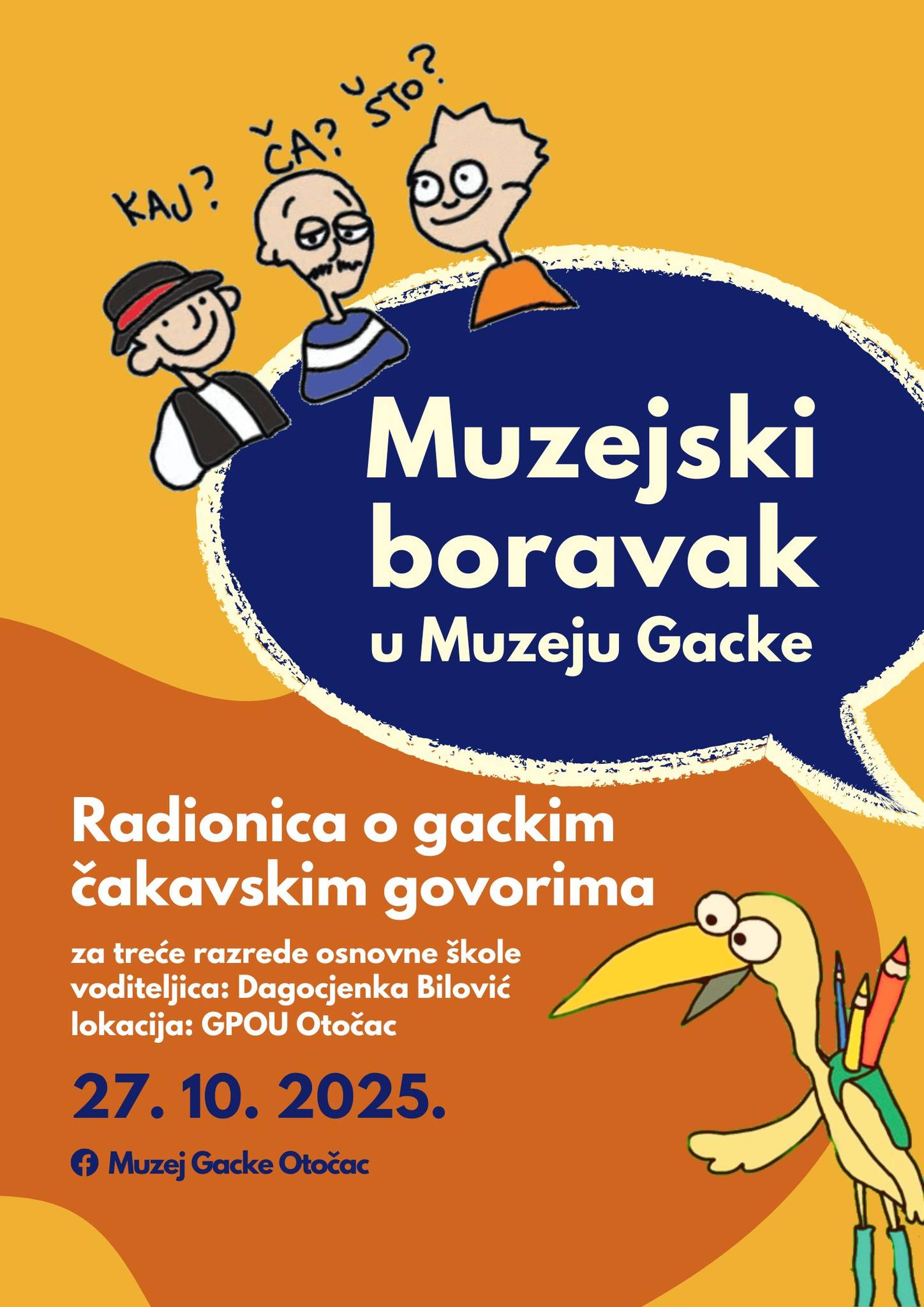 U sklopu programa “Muzejski boravak” u Gackom pučkom otvorenom učilištu održana je 27. listopada 2025. dvosatna radionica posvećena gackim čakavskim govorima. Na radionici je sudjelovalo oko 60 učenika trećih razreda Osnovne škole Zrinskih i Frankopana Otočac, a voditeljica radionice Dragocjenka Bilović polaznike je upoznala s posebnostima hrvatskog jezika.