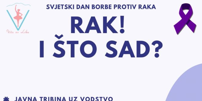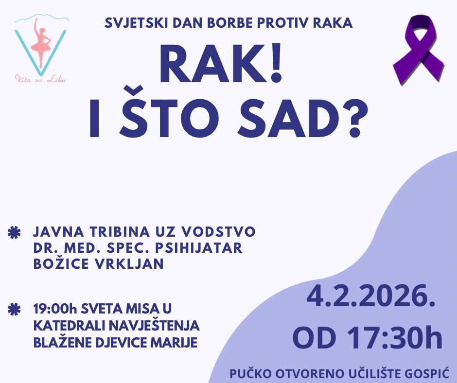 Povodom obilježavanja Svjetskog dana borbe protiv raka, Udruga “Vila za Liku” poziva vas na javnu tribinu „Rak! I što sad?“ koja će se održati 04. veljače 2026. godine s početkom u 17:30 sati u POU “Dr. Ante Starčević” Gospić.