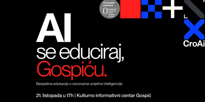 Hrvatska udruga za umjetnu inteligenciju (CroAI) organizira besplatnu edukaciju “AI se educiraj” u Gospiću, otvorenu za nastavnike, profesore, ravnatelje, nenastavno osoblje, ali i sve zainteresirane građane. Edukacija će se održati 21. listopada od 17:00 do 19:00 sati u Kulturno informativnom centru Gospić. Cilj ove interaktivne edukacije je upoznati sudionike s osnovama umjetne inteligencije, njenom primjenom u obrazovanju te etičkim izazovima koji prate implementaciju ovih tehnologija. Predavač će biti Davor Aničić, CEO VelebitAI i stručnjak u području umjetne inteligencije.