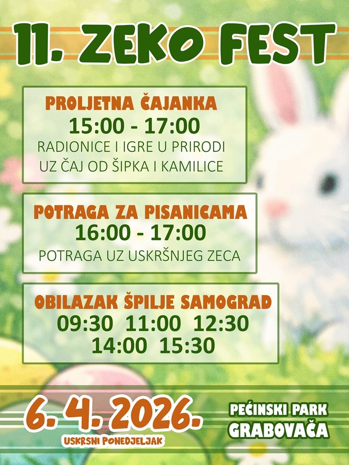 Ove godine, 11. po redu ZEKO FEST održava se u ponedjeljak, 6. travnja 2026., u Pećinskom parku Grabovača. Program počinje u 15:00 i traje do 17:00 sati, a osmišljen je tako da zabavi cijelu obitelj i približi djecu prirodi kroz igre i radionice.