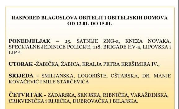 Župa Navještenja Blažene Djevice Marije u Gospiću objavila je raspored blagoslova obitelji i obiteljskih domova koji će se održavati od 12. do 15. siječnja. Prema utvrđenom rasporedu, blagoslovi će se odvijati po gradskim ulicama i naseljima od ponedjeljka do četvrtka. Vjernici su pozvani da prema objavljenom planu pripreme svoje domove za blagoslov.